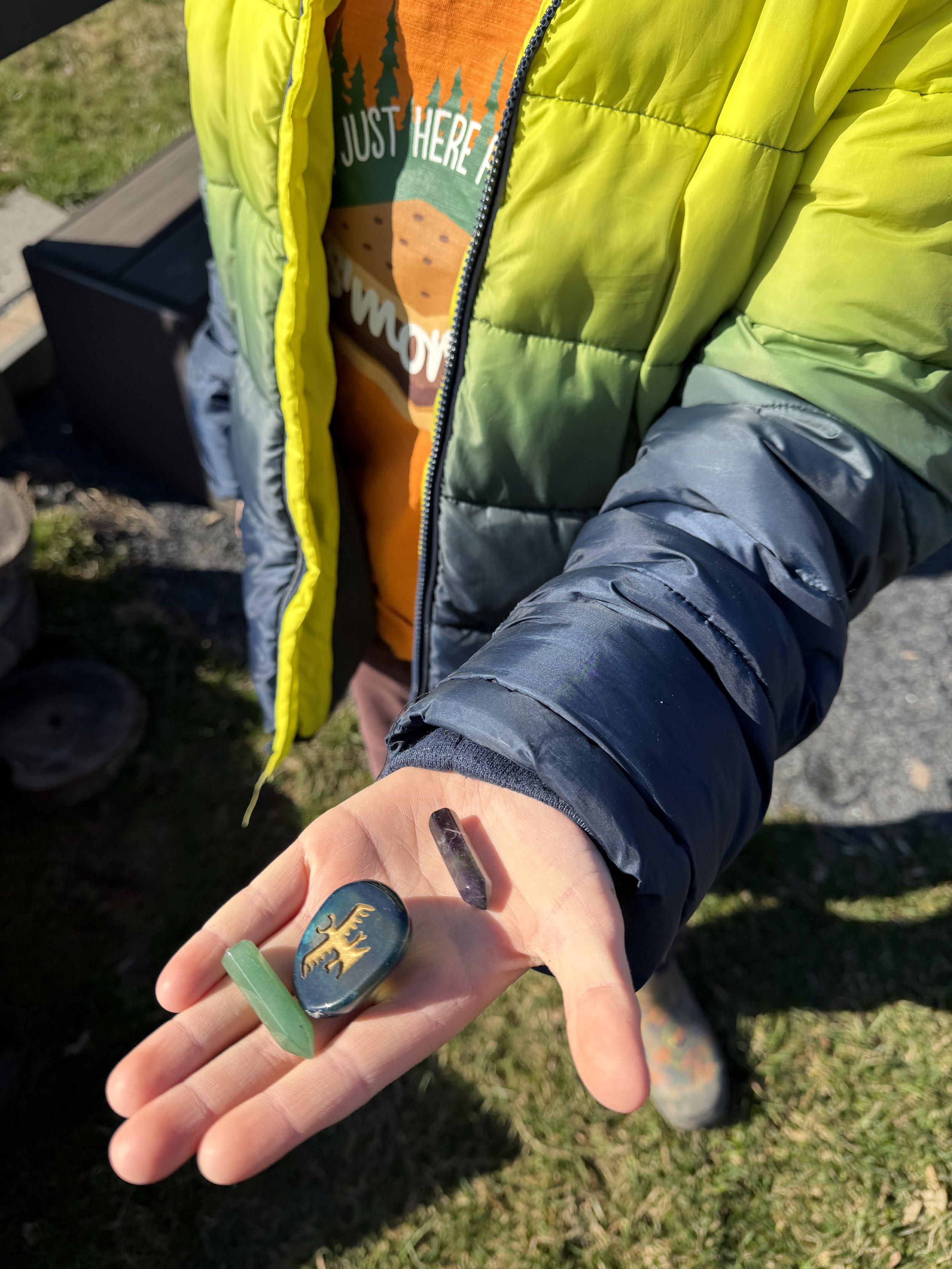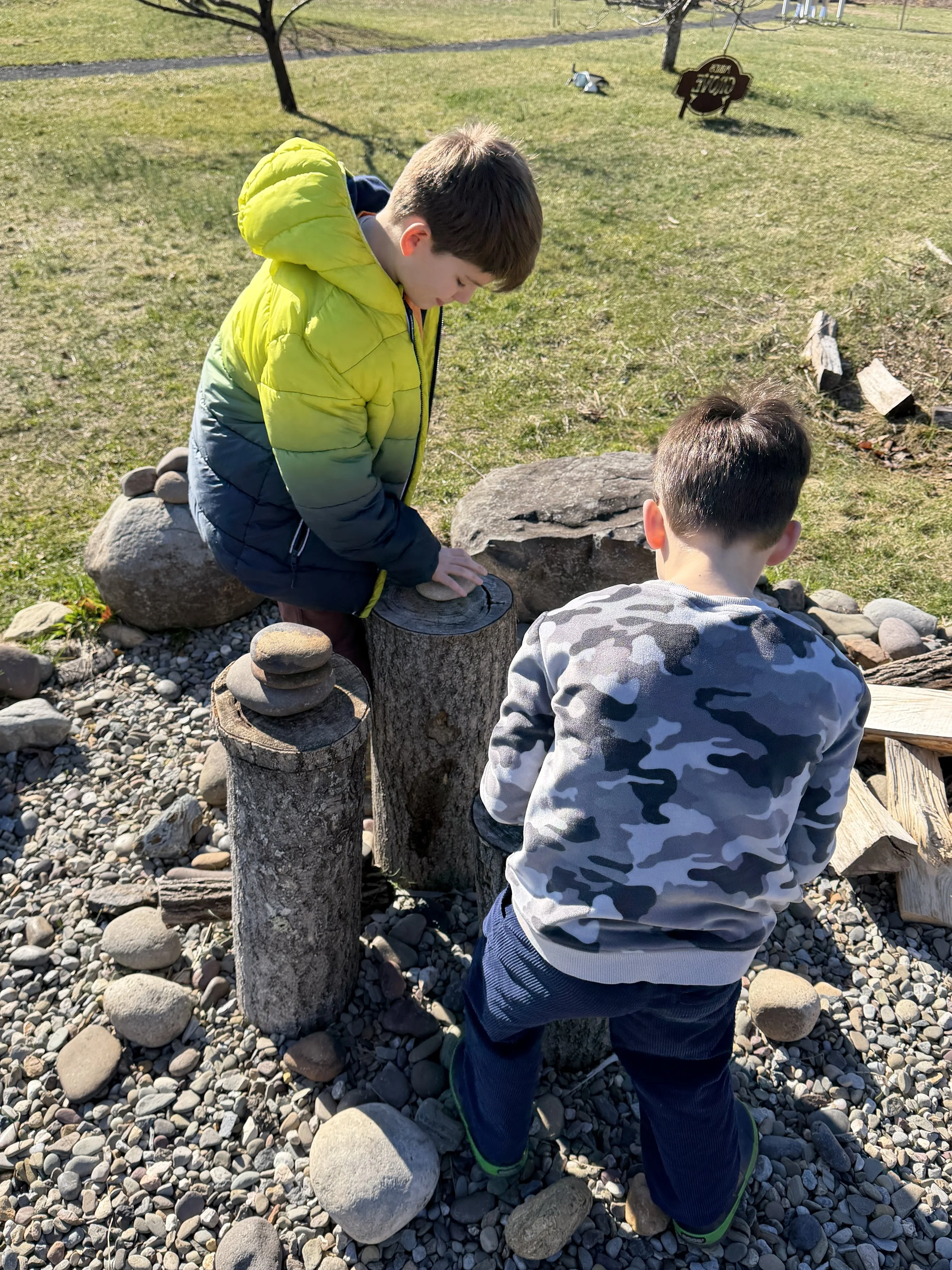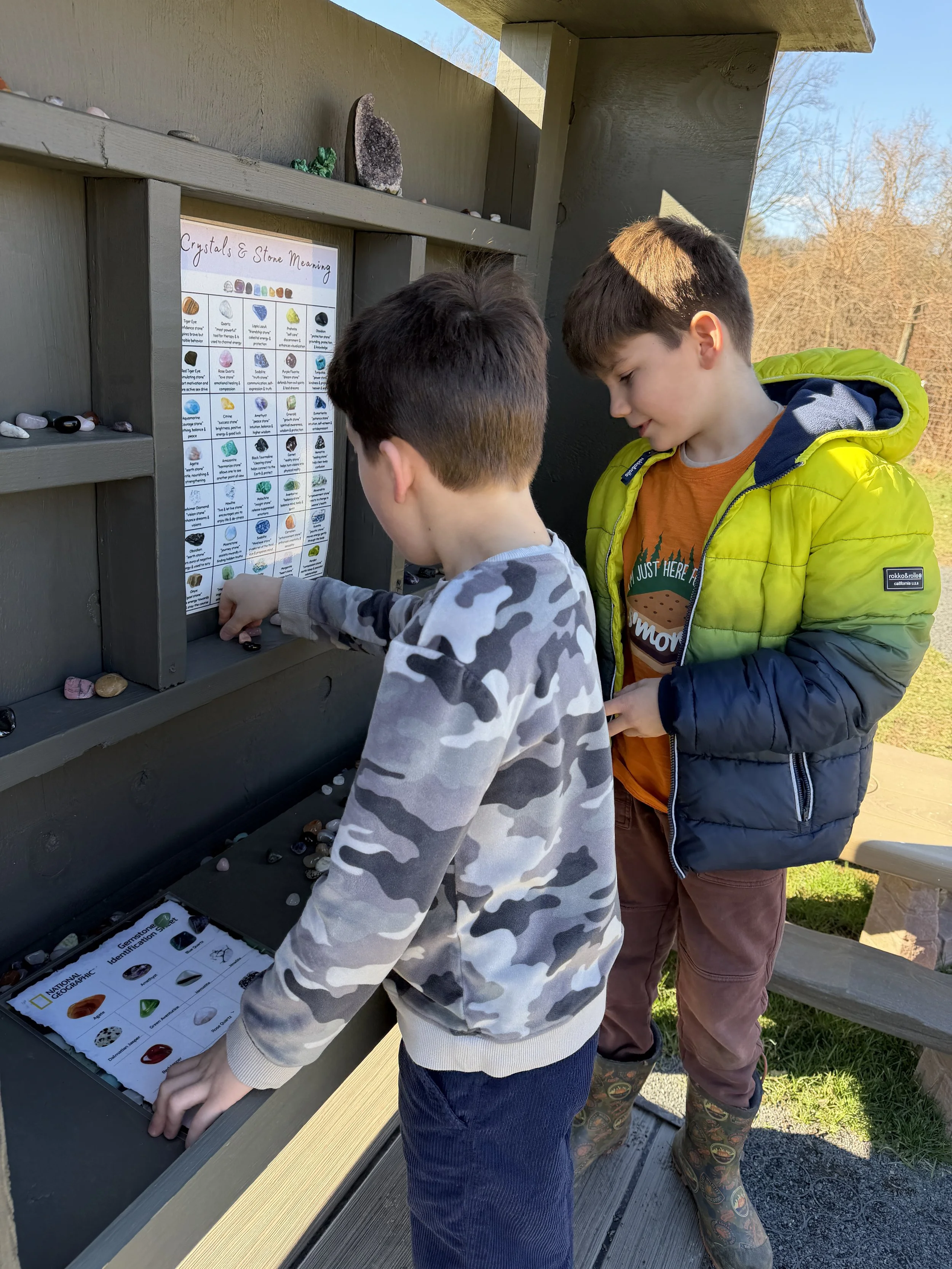 Rhys and Keats like to stack rocks and sort gems.