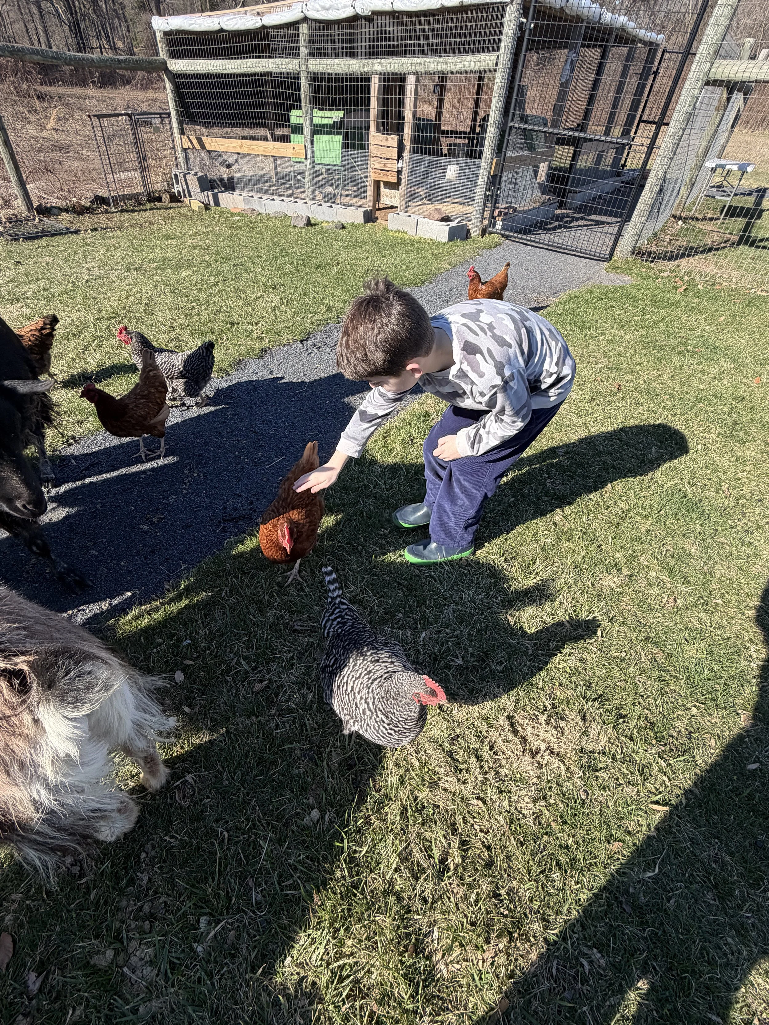 Molly, Rhys, and Keats are very gentle. The chickens are curious and like