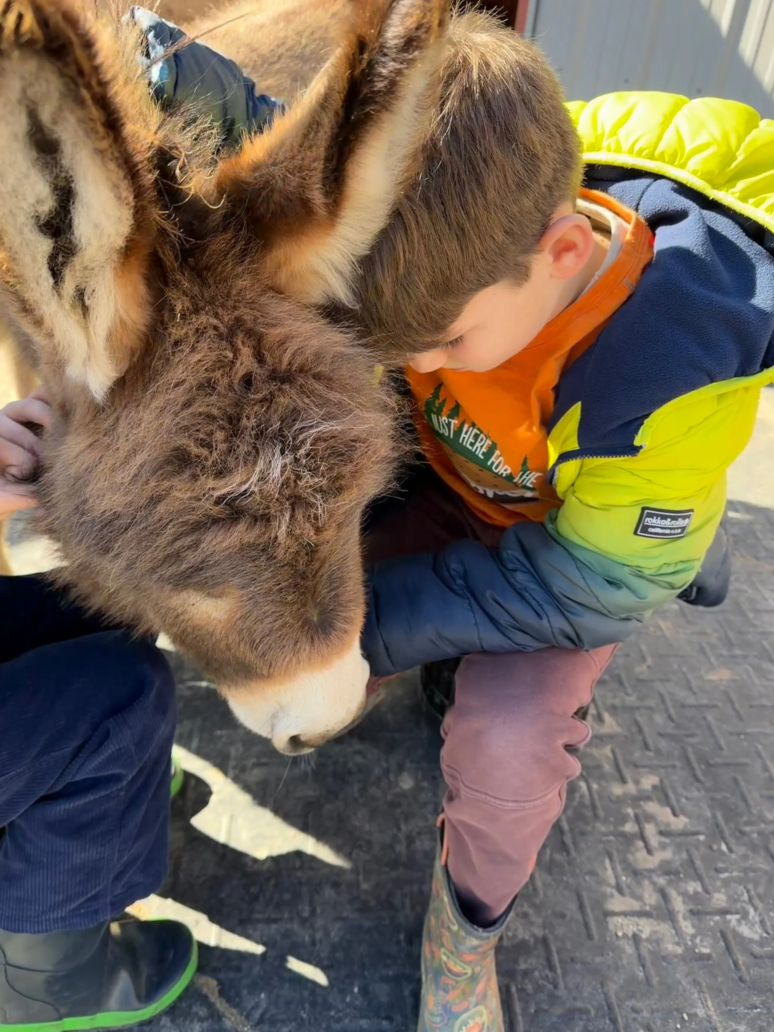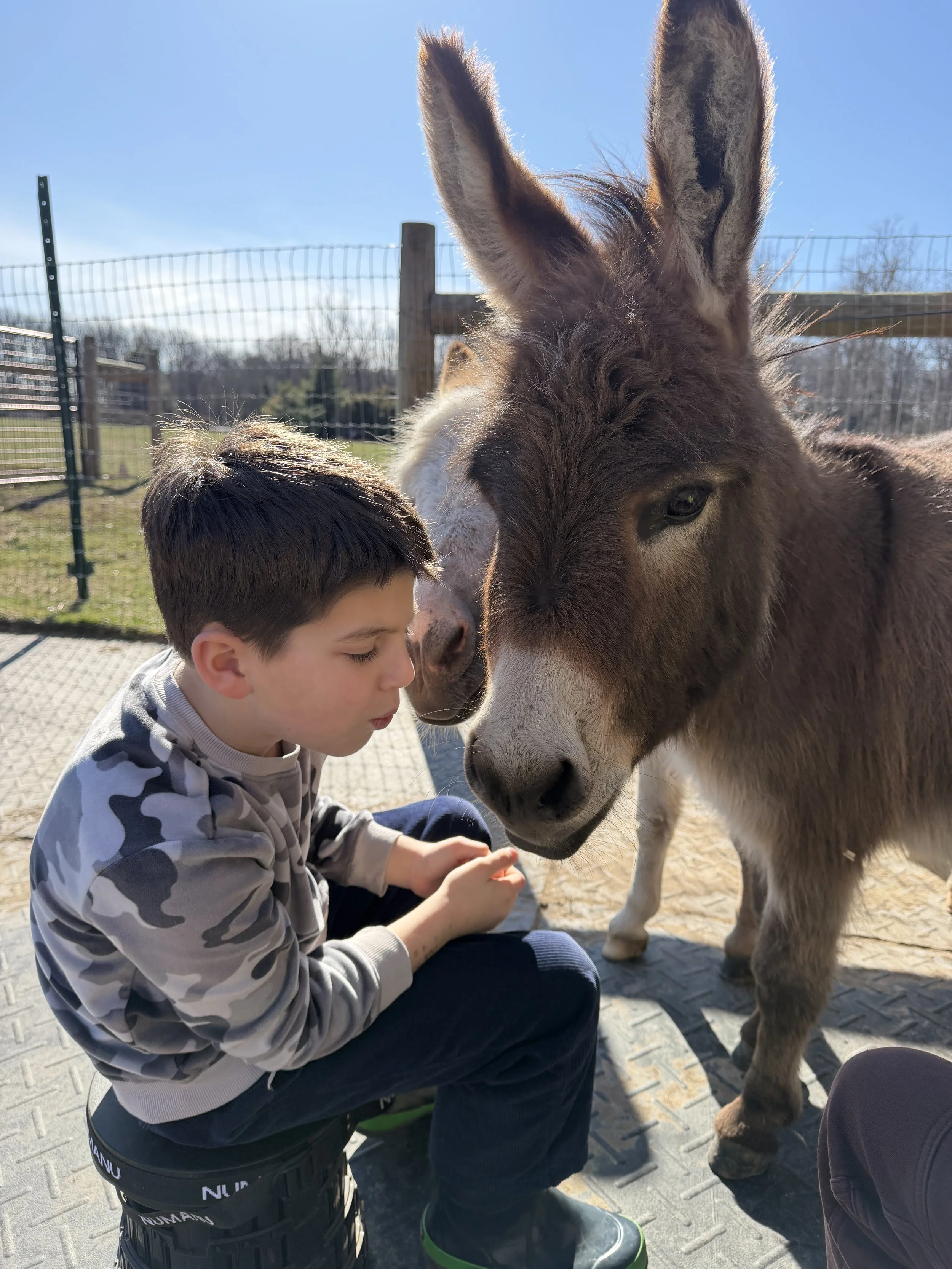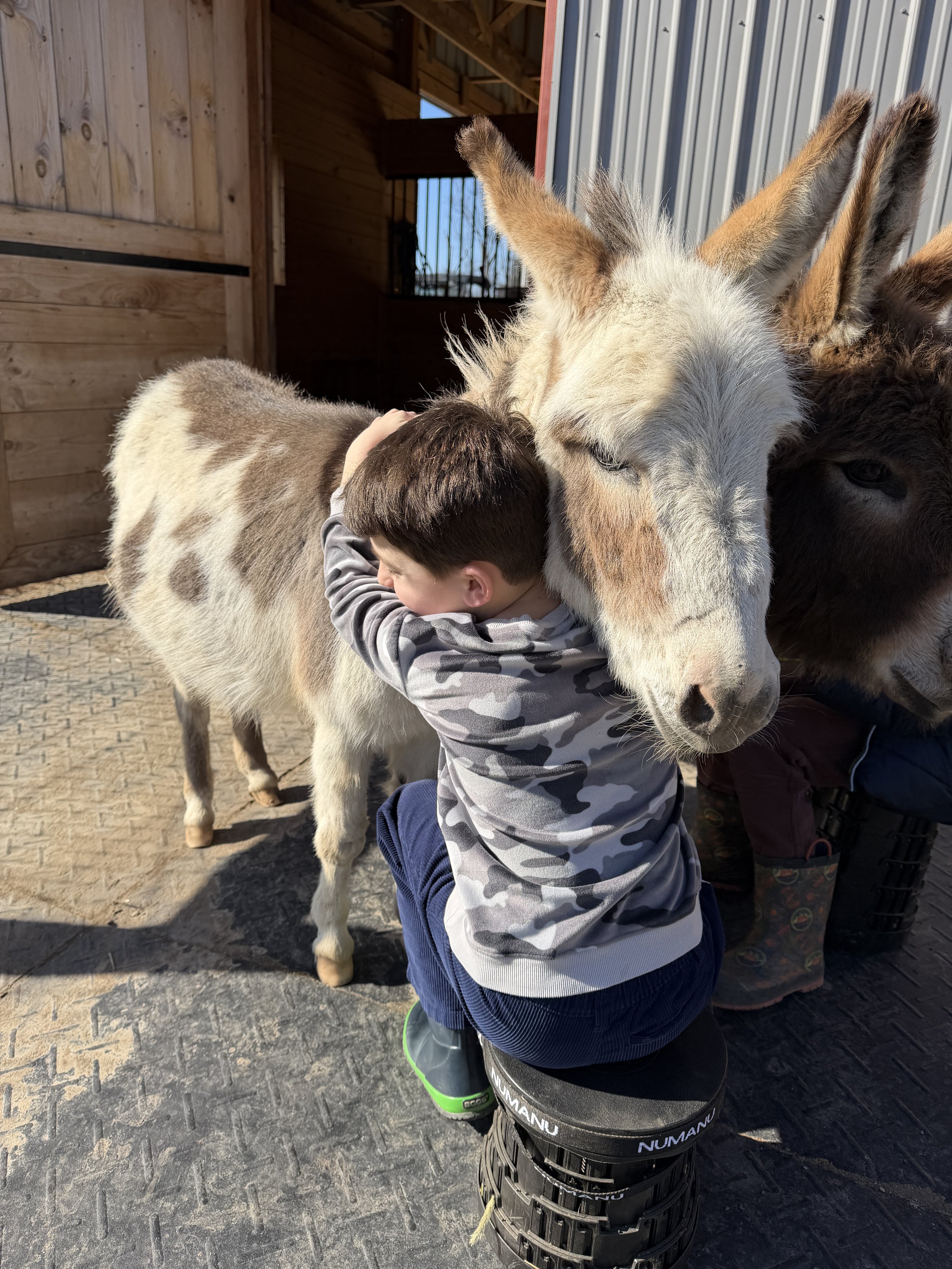 Both donkeys are very sweet and gentle. They love getting attention. The donkeys like it best when visitors sit on stools or in chairs when they first meet. Donkeys do not like people running near them.