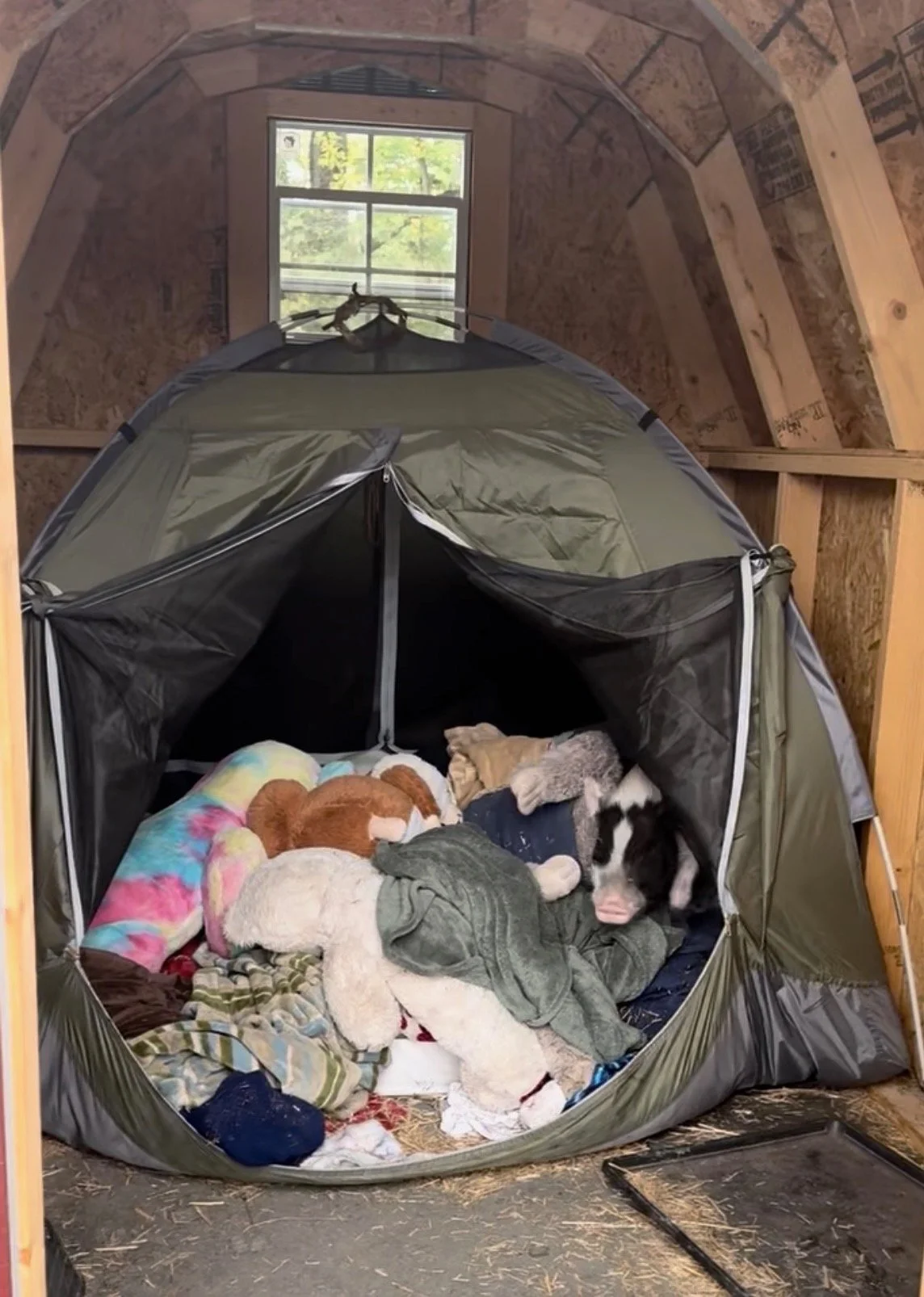 The pigs sleep in a tent inside their shed. Can you find Marty hidden with the stuffed animals?